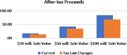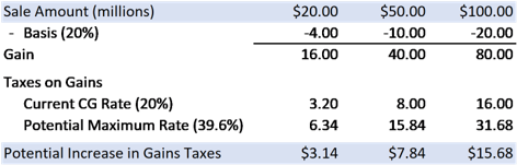 The capital gains tax is particularly concerning to owners interested in beginning a sales process. The simple example illustrates the impact of an increased capital gains rate on the sale of a $20M, $50M, and $100M business (assuming a basis of 20% of the sales proceeds).